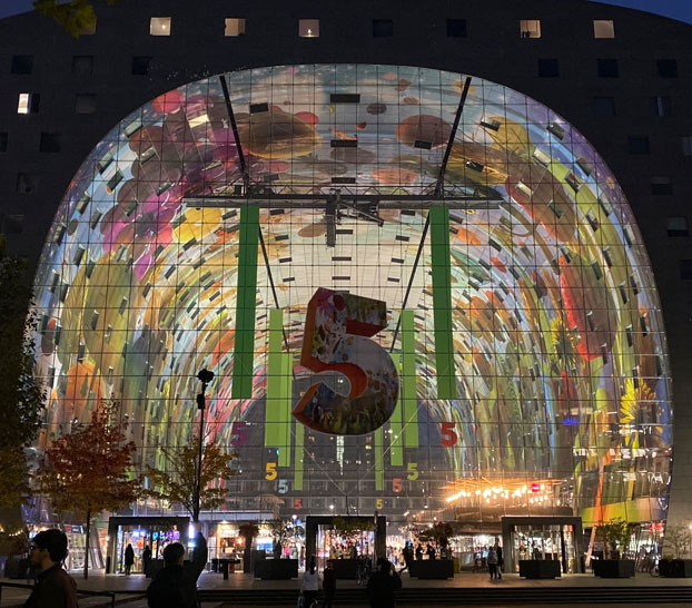 Wandering the streets of historic central Rotterdam one evening, I found myself standing in awe outside Markethal. It was a surprise to see the landscape around me open to reveal this intriguing contemporary, arched, mixed-use development which provides space for a fresh food hall, restaurants, and 228 apartments.
